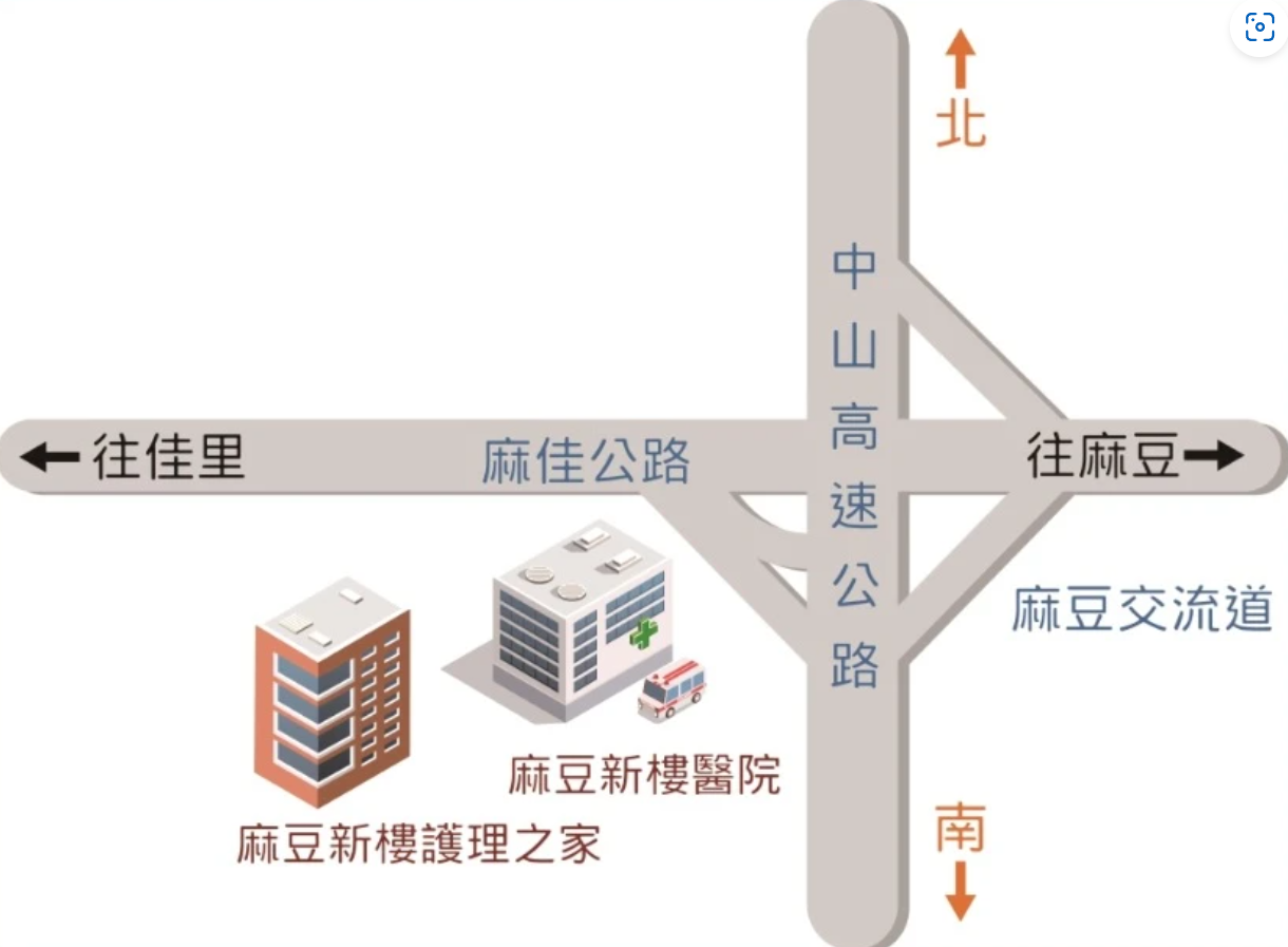 2.經由高速公路-由麻豆交流道下,往佳里方向行駛,約200公尺,即可抵達麻豆新樓醫院。